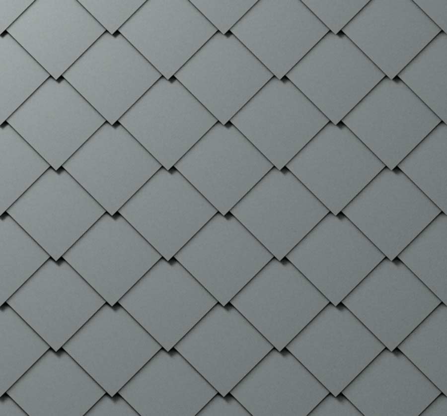 PREFA Fasádní šablona ve velkorysém formátu 44x44 cm propůjčuje osvědčenému "šupinovému" povrchu překvapující akcenty. Fascinující tvar šablony umožňuje realizaci fasád v moderně strukturovaném pojetí, které podtrhuje celkovou kvalitu projektu a z každé budovy učiní unikát s vlastním charakterem. Díky integrovanému upevnění lze fasádní prvky montovat rychle a cenově výhodně.